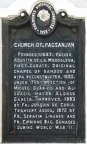 A former visita of Lumban, the parish church of Pagsanjan was founded on November 12, 1687, by Franciscan missionary Father Agustin de la Magdalena as its first pastor (parish priest).[3][4] The first church was originally made of light materials like bamboo, nipa and wood in 1688 by natives of Pagsanjan under forced labor.[2][5] A larger and more solid church constructed from adobe with a red-tiled roof was built in 1690 with the help of Chinese Miguel Guan Co and chief alguacil alferez Alonzo Garcia to replace the original church.[2][5]