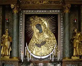 The flowers were references to hortus conclusus (enclosed garden), and a symbol of Mary's virginity and purity.[10] The circle of stars represents the immaculate conception. The head of Our Lady is adorned with two crowns. Two little angels lower the large Rococo-style crown with colored glass inlays upon the smaller Baroque crown.[10] Some argued that the two crowns, resembling royal and ducal insignia, represented the Kingdom of Poland and the Grand Duchy of Lithuania respectively.[12] In 1927, duplicate crowns were made of pure gold, donated by the people, and were blessed by Pope Pius XI.[10] On 2 July 1927 the Canonical Coronation took place and the painting received the title of Mother of Mercy. The gold crowns were lost, possibly during World War II.[10]