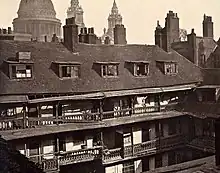It was built in the seventeenth century, before being rebuilt and extended after the Great Fire.[1][2] The replacement of horse-drawn coaches by the railways inevitably led to its decline, finally being pulled down in 1876 to be replaced by warehouses.[3]