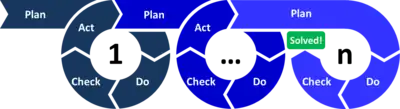 PDCA or plan–do–check–act (sometimes called plan–do–check–adjust) is an iterative design and management method used in business for the control and continual improvement of processes and products.[1] It is also known as the Shewhart cycle, or the control circle/cycle. Another version of this PDCA cycle is OPDCA.[2] The added "O" stands for observation or as some versions say: "Observe the current condition." This emphasis on observation and current condition has currency with the literature on lean manufacturing and the Toyota Production System.[3] The PDCA cycle, with Ishikawa's changes, can be traced back to S. Mizuno of the Tokyo Institute of Technology in 1959.[4]