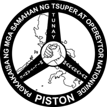 Established in 1981, PISTON is a national federation of drivers and operators' associations focusing on issues related to the public transportation sector, especially the rights of drivers and operators of public utility vehicles (PUVs) – including jeepneys, taxis, vans, multicabs, tricycles, pedicabs and buses.[1]