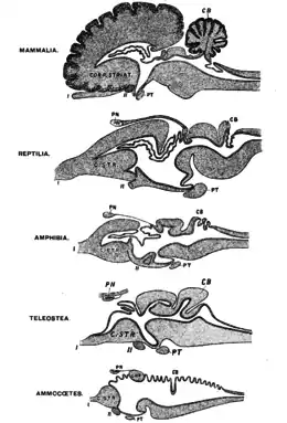 Brains of vertebrate classes. CB., cerebellum; PT., pituitary body; PN., pineal body; C. STR., corpus striatum; G.H.R., right ganglion habenulæ. I., olfactory; II., optic nerves.