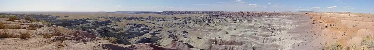 The Painted Desert is a United States desert of badlands in the Four Corners area,[2] running from near the east end of Grand Canyon National Park and southeast into Petrified Forest National Park. It is most easily accessed from the north portion of Petrified Forest National Park. The Painted Desert is known for its brilliant and varied colors: these include the more common red rock, but also shades of lavender.