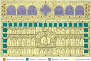 The Pala d'Oro was thought to be first commissioned in 976 by Doge Pietro Orseolo, where it was made up of precious stones and several enamels depicting various saints, and in 1105 it was expanded on by Doge Ordelafo Faliero.[1] In 1345, the goldsmith Giovanni Paolo Bonesegna was commissioned to complete the altarpiece by Andrea Dandolo, who was the procurator at the time, and later became doge. Bonesegna added a Gothic-style frame to the piece, along with more precious stones.[2] Dandolo also included an inscription describing what his own additions were, along with those of his predecessors.[3]