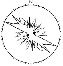 Paleostress inversion refers to the determination of paleostress history from evidence found in rocks, based on the principle that past tectonic stress should have left traces in the rocks.[1] Such relationships have been discovered from field studies for years: qualitative and quantitative analyses of deformation structures are useful for understanding the distribution and transformation of paleostress fields controlled by sequential tectonic events.[2] Deformation ranges from microscopic to regional scale, and from brittle to ductile behaviour, depending on the rheology of the rock, orientation and magnitude of the stress, etc. Therefore, detailed observations in outcrops, as well as in thin sections, are important in reconstructing the paleostress trajectories.