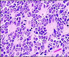 A Homer Wright pseudorosette is a type of pseudorosette in which differentiated tumor cells surround the neuropil.[15] Examples of tumors containing these are neuroblastoma, medulloblastoma, pinealoblastoma, and primitive neuroectodermal tumors of bone. Homer Wright rosettes are considered "pseudo" in the sense that they are not true rosettes. True rosettes are Flexner–Wintersteiner rosette, which contain an empty lumen. Homer Wright rosettes contain abundant fibrillary material. They are named for James Homer Wright.