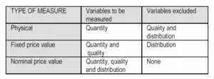 The measures of partial productivity are physical measures, nominal price value measures and fixed price value measures. These measures differ from one another by the variables they measure and by the variables excluded from measurements. By excluding variables from measurement makes it possible to better focus the measurement on a given variable, yet, this means a more narrow approach. The table below was compiled to compare the basic types of measurement. The first column presents the measure types, the second the variables being measured, and the third column gives the variables excluded from measurement.