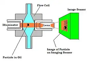 If direct imaging is used, a halogen light illuminates particles from the back within a cell while a high definition, high magnification camera records passing particles. Recorded video is then analyzed by computer software to measure particle attributes. Direct imaging particle counting employs the use of a high resolution camera and a light to detect particles. Vision based particle sizing units obtain two dimensional images that are analyzed by computer software to obtain particle size measurement in both the laboratory and online. Along with particle size, color and shape analysis can also be determined. Direct imaging is a technique that uses the light emitted by a laser as a source to illuminate a cell where particles are passing through. The technique does not measure the light blocked by the particles, but rather measures the area of the particles functioning like an automated microscope. A pulsed laser diode freezes the particle motion. The light transmitted through the fluid is imaged onto an electronic camera with macro focusing optics. The particles in the sample will block the light, and the resulting silhouettes will be imaged onto the digital camera chip.