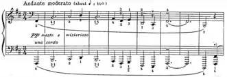 The work is a passacaglia based on the first 8 measures of Schubert's Unfinished Symphony. The theme is stated exactly, but with an F# added at the start which aids in transition between the variations. There are forty-four variations, followed by an epilogue, a cadenza, and then closing with a four-part fugue,[1][2] following the pattern established for this form by the likes of Bach (Passacaglia and Fugue in C minor, BWV 582) and Brahms (Variations and Fugue on a Theme by Handel). The writing makes stylistic references to Brahms himself (variations 31-35, 38 & 39), as well as Chopin (variations 9 & 27), Rachmaninoff (variations 19, 20 & 24), and others (Scarlatti, Ravel, and Richard Strauss).[3] In variation 39 there is an obvious reference to Schubert's Erlkönig. Schubert's Fantaisie in F minor (var.42) and the famous string ostinato that follows the opening of the original symphony (end of fugue) are quoted as well.
