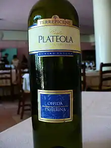 Passerina is both a rare local white grape that is found in the Italian region of Marche, and a DOC for wines of the same name. Many researchers have studied its identity, so to boast an extensive bibliography and a high number of citations of the grapes on the most famous treatises of ampelography. However, its origins remain uncertain. Known by various names, such as "Pagadebito Gentile", "Campolese" and "Uva Passera", the term "Passerina" is attributed to those grapes that have small berries often devoid of seeds. Passerina is used in some Marche wine blends, including the DOC Falerio dei Colli Ascolani.[1]
