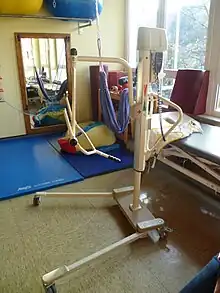 A patient lift (patient hoist, jack hoist, Hoyer lift, or hydraulic lift) may be either a sling lift or a sit-to-stand lift. This is an assistive device that allows patients in hospitals and nursing homes and people receiving home health care to be transferred between a bed and a chair or other similar resting places, by the use of electrical or hydraulic power. Sling lifts are used for patients whose mobility is limited. Sling lifts are mobile (or floor) lifts or overhead lifts (ceiling- or wall-mounted, or using overhead tracks).[1][2]