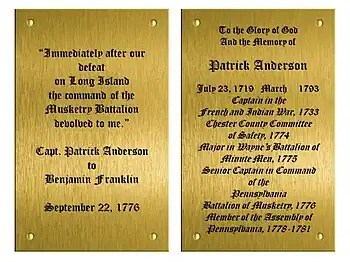 He fought bravely at the Battle of Long Island, Battle of Fort Washington, the Battle of Brandywine and Battle of Germantown. A letter from Anderson to Benjamin Franklin describing the disarray of the Pennsylvania troops after the Battle of Long Island is preserved in the Pennsylvania State Archives.[4][lower-alpha 1]