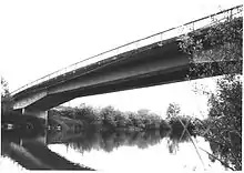 Built in 1950, the Patton Bridge spans the Green River near the city of Auburn in King County, Washington. The bridge is a three-span cantilever with two anchor arms, two cantilever arms and a suspended section. It includes a combination of concrete and steel box girders. The bridge was designed by Homer M. Hadley, a consulting engineer from Washington State.[2] The anchor arms and cantilever arms are multiple box, two-cell reinforced concrete box girders. The suspended section consists of two spread, welded steel box girders with reinforced concrete deck. The concrete deck is fixed to the top flange plate of the girders with steel shear developers. Utilization of this deck design allows the concrete deck and steel box girders to act in composite design; i.e., the bottom flange of the steel box resists tensile forces while the concrete deck resists compressive forces.[2] The Patton Bridge's anchor arms are 115 feet (35 m) feet long, the cantilever arms are 50 feet (15 m) long, and the suspended span is 100 feet (30 m). The bridge has a total length of 430 feet (130 m). The center span of 200 feet (61 m) is the longest box girder span constructed in the state during the 1940s.[2]