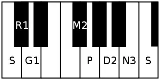 - ārohaṇa: S R₁ G₁ M₂ P D₂ N₃ Ṡ[lower-alpha 1]