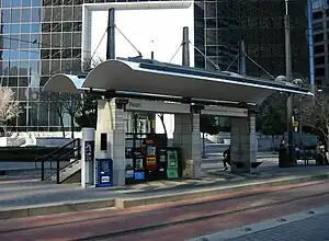 Pearl Street/Arts District station (formerly Pearl station) is a DART Light Rail station located in Dallas, Texas. It is located on Bryan Street, east of Pearl Street, in the City Center District. It opened June 14, 1996, and is the easternmost station on the trunk line segment shared by the Red, Blue, Green and Orange Lines, serving the Plaza of the Americas, the Sheraton Dallas Hotel, 2001 Bryan Tower, the San Jacinto Tower, the Morton H. Meyerson Symphony Center and JPMorgan Chase Tower.