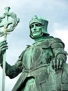 The memorial features a 2.1 m (6 ft 11 in) high bronze statue by George Frampton depicting Saint George in medieval armour, standing on a slain dragon. Saint George is raising the hilt of his sword in his left hand to form a cross, encircled by a wreath, and resting his left hand on a shield which bears Saint George's Cross. The cast bears the name and date "GEO. FRAMPTON RA / 1919".