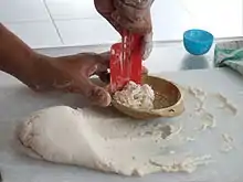 Pempek dough is made from a mixture of boneless ground fish meat, most commonly tenggiri (wahoo), with water, salt and sago flour. Sometimes, people also add a little bit of cooking oil and/or wheat flour to improve the texture and to make the pempek not too chewy, they also add MSG to enrich the umami taste. Ikan gabus (snakehead) is also commonly made as pempek. Numerous pempek sellers and producers in Palembang use a cheap combination of fish, which has a strong scent. According to tradition, the best tasting pempek are made of belida or belido (Chitala lopis), but due to its rarity and superior taste, pempek made from this fish are usually more expensive.[5] Pempek in Bangka Island are made from mackerel (ikan kembung) and its sauce is red chilli based, while in Jakarta or other cities they could be made from gourami fish. The latest variant is pempek udang, pempek made of minced shrimp originated from Sungsang area in Banyuasin near the Musi river estuary,[6] it is noticeable with its pinkish color.