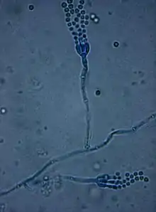 The thallus (mycelium) consists of highly branched networks of multinucleated, usually colourless hyphae, with each pair of cells separated by a septum. Conidiophores are at the end of each branch accompanied by green spherical constricted units called conidia. These propagules play a significant role in reproduction; conidia are the main dispersal strategy of these fungi.[8]