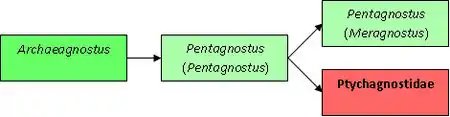 Schematic showing the relationship between both subgenera of Pentagnostus (light green), the ancestral Archaeagnostus (darker green) and the descending Ptychagnostidae (red). Based on E. B. Naimark (2012). Hundred species of the genus Peronopsis Hawle et Corda, 1847. Paleontological Journal 46(9):945-1057