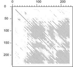 Dot plot of the HglK protein against itself showing repeats as diagonal lines.