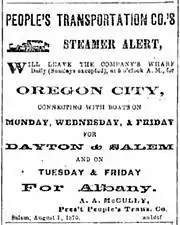 In 1867, the People's Transportation Company advertised freight service to McMinnville at a rate of $7.00 per ton.[36] Also in September 1867, the steamers Enterprise and Echo were reported to be able to make regular trips to Albany because navigation obstacles in the river had been removed.[37] The P.T. Company was building a new shallow-draft steamer at Canemah in September 1867.[37] Echo was reported to have beaten the stage coach a good part of the way to Salem.[37]
