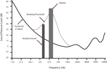 Suppose a listener can hear a given acoustical signal under silent conditions. When a signal is playing while another sound is being played (a masker), the signal has to be stronger for the listener to hear it. The masker does not need to have the frequency components of the original signal for masking to happen. A masked signal can be heard even though it is weaker than the masker. Masking happens when a signal and a masker are played together—for instance, when one person whispers while another person shouts—and the listener doesn't hear the weaker signal as it has been masked by the louder masker. Masking can also happen to a signal before a masker starts or after a masker stops. For example, a single sudden loud clap sound can make sounds inaudible that immediately precede or follow. The effects of backward masking is weaker than forward masking. The masking effect has been widely studied in psychoacoustical research. One can change the level of the masker and measure the threshold, then create a diagram of a psychophysical tuning curve that will reveal similar features. Masking effects are also used in lossy audio encoding, such as MP3.