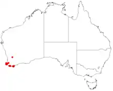 This geebung is found on poorly-drained or loamy soils in swamps, heath, woodland and forest within 40 km (25 mi) of the coast between Margaret River and Albany.[3][4]