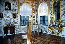 The East and West Chinese Cabinets were decorated between 1766 and 1769 to exhibit objects of decorative art imported from the East. The walls were decorated with imitation Oriental patterns by Russian craftsmen, and hung with Chinese landscape paintings in yellow and black lacquer. Another room, positioned at the centre of the palace, bears the name of the Picture Hall.