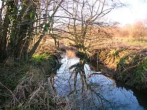 The wharf at Haslingbourne has entirely disappeared and an electricity sub-station and a former water treatment plant, which pumped water from springs at the foot of Gore Hill to Petworth, are on the site. The area is now used for storage of construction machinery. Below Haslingbourne Cottages the stream flows in the canal bed which is cut through sandstone beds, creating a shaded artificial gorge rich in mosses and lichens. Emerging from this cutting at the site of Upper Lock the canal follows a straight course across low lying boggy ground, fenced off as a nature reserve area. Reaching the site of Haines Lock the stream can be heard pouring through a broken down weir in the undergrowth as it turns eastward into its natural course. The west bank of the canal here runs into the pasture for some twenty metres and the position of the levelled course beyond can just be discerned. Beyond the slightly higher ground here, as the Haslingbourne Stream again comes close to the canal, the embankments can be seen forming a straight line across the floodplain to the river. A pond near the river is the site of a weir and tumblebay.