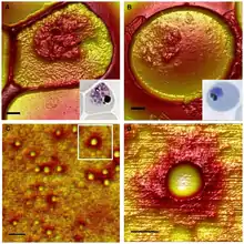 - ↑ Nagao E, Kaneko O, Dvorak JA (May 2000). "Plasmodium falciparum-infected erythrocytes: qualitative and quantitative analyses of parasite-induced knobs by atomic force microscopy". Journal of Structural Biology. 130 (1): 34–44. doi:10.1006/jsbi.2000.4236. PMID 10806089.