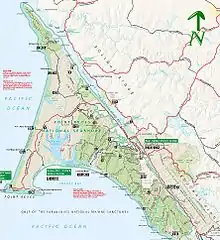 The Phillip Burton Wilderness is part of the 111 sq. mile (288 km2) Point Reyes National Seashore located about 20 miles (32 km) northeast of San Francisco, California. Total wilderness land is 33,373 acres[1] which includes a roadless "potential wilderness" area of over 8,000 acres (32 km2) and is one of only three designated wilderness along the California coast, the others being the King Range Wilderness and the Rocks and Islands Wilderness. The National Park Service manages the wilderness.