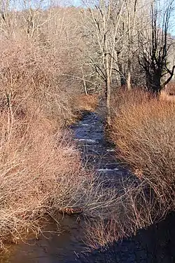 The headwaters of Phillips Creek are in North Mountain.[7] The creek has an obstruction in its lower reaches, near Huntington Road.[8] The Gauckler–Manning coefficient value of the creek is 0.045 for its channel and ranges from 0.070 to 0.100 for its overbank.[5]