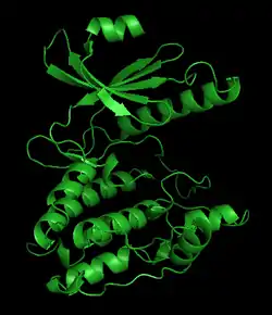 - 1 2 Owen DJ, Noble ME, Garman EF, Papageorgiou AC, Johnson LN (1995). "Two structures of the catalytic domain of phosphorylase kinase: an active protein kinase complexed with substrate analogue and product". Structure. 3 (5): 467–482. doi:10.1016/S0969-2126(01)00180-0. PMID 7663944.