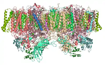 - ↑ Kamiya N, Shen JR (January 2003). "Crystal structure of oxygen-evolving photosystem II from Thermosynechococcus vulcanus at 3.7-A resolution". Proceedings of the National Academy of Sciences of the United States of America. 100 (1): 98–103. Bibcode:2003PNAS..100...98K. doi:10.1073/pnas.0135651100. PMC 140893. PMID 12518057.