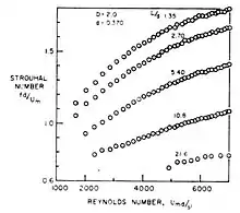 For many applications, the first equation below is often used. A review of the literature[23] produced the figure on the right for the Strouhal number. At low Reynolds numbers the Strouhal number rises as inertial effects begin to dominate and then decays slightly at higher numbers. The second equation below is a best fit for the data for 1000 < Re < 100000.
