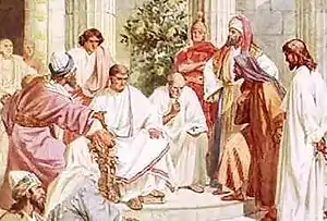 The Gospel of Mark uses the word aulē ("hall", "palace") to identify the praetorium.[4] Fearing defilement, the Sanhedrin elders did not enter the court, and Pilate's discussion with them occurred outside the praetorium.[4] Outside the praetorium proper, there was an area called the Pavement.[5] Pilate's judgement seat (Greek: bēma), in which he conversed with the elders, was located there.[4]