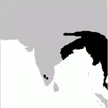 In India, there are disjunct populations in southern India. This population was recorded by Salim Ali from Antharasanthe near the Kabini reservoir. There were no records of the species from this area after the initial collection. The southern population was rediscovered from the Masinagudi area in Mudumalai in 2004.[11]