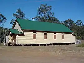 The Congregational Church commenced services at Pine Mountain circa 1863.[9] In May 1873 a Congregational Chapel was erected on a 3.5-acre (1.4 ha) site with a chapel that was relocated from Bremer Mills (at Bundamba).[10] This chapel was used to house a provisional school under teacher Mr Bryce with an enrolment of 50 to 60 children and an average attendance of about 30 children.[11]