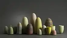 Another feature of Drysdale's later oeuvre are her assemblages of asymmetrical pieces, suites of closed forms that echo geological features of Australia, such as the Devils Marbles series, inspired by the Karlu Karlu / Devils Marbles Conservation Reserve in the Northern Territory.[18]