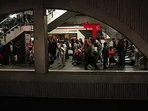 Plaça de Catalunya station, also known as Barcelona-Plaça Catalunya,[1][2] Plaça Catalunya or simply Catalunya[3] is a major station complex in Barcelona located under Plaça de Catalunya, the city's central square and a large transport hub. Many Rodalies de Catalunya, Barcelona Metro and Ferrocarrils de la Generalitat de Catalunya lines go through it and many bus routes link it with all of the districts of the city and most of the municipalities in its metropolitan area.