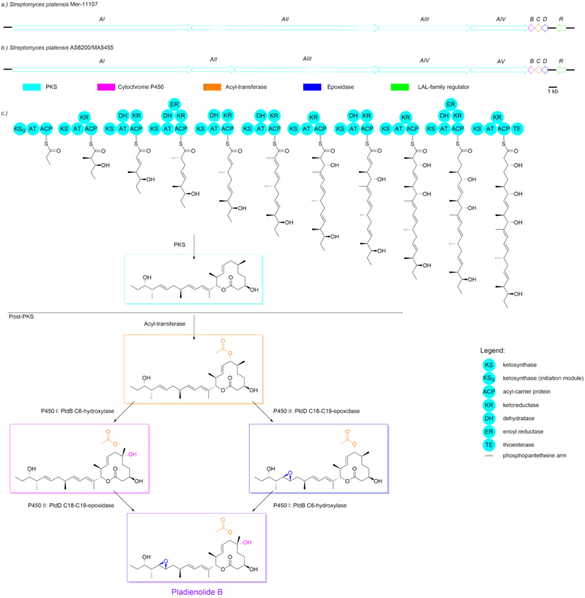 Post-PKS modifications: Acetyl-transferase (AT) transfers an acetyl group to carbon 7. The following step is either that a P450 I enzyme (PldB C6-hydroxylase) adds a hydroxyl group on carbon 6, and/or that an epoxide group is added between carbons 18 and 19 by P450 II (PldD C18-C19-epoxidase). Based on the purification results of these post-PKS compounds by Boothe et al.,[2] it seems that either hydroxylation or acetylation could occur first, but Boothe et al.[2] found a that hydroxylation seems to occur first more than twice as often as acetylation occurs first.[2] However, regardless of hydroxylation or acetylation occurring first, the result of these tailoring steps yields pladienolide B (Figure 1).