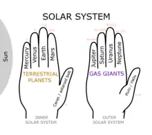 A planetary mnemonic refers to a phrase created to remember the planets and dwarf planets of the Solar System, with the order of words corresponding to increasing sidereal periods of the bodies. One simple visual mnemonic is to hold out both hands side-by-side with thumbs in the same direction (typically left-hand facing palm down, and right-hand palm up). The fingers of hand with palm down represent the terrestrial planets where the left pinkie represents Mercury and its thumb represents the asteroid belt, including Ceres. The other hand represents the gas giants, with its thumb representing trans-Neptunian objects, including Pluto.