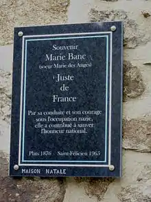 Commemorative plaque for Marie Banc (Sister Mary of the Angels) at the house of her birth in Plats.