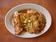 Plum sauce is a viscous, light-brown sweet and sour condiment. It is used in Cantonese cuisine as a dip for deep-fried dishes, such as spring rolls, noodles, and deep-fried chicken balls as well as for roast duck. It is made from sweet plums or other fruit such as peach, pineapple or apricot, along with sugar, vinegar, salt, ginger and chili peppers.[1][2]