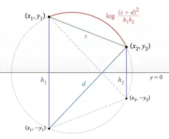 The distance between two points in the half-plane model can be computed in terms of Euclidean distances in an isosceles trapezoid formed by the points and their reflection across the x-axis: a "side length" s, a "diagonal" d, and two "heights" h1 and h2. It is the logarithm dist(p1, p2) = log((s + d)2/h1h2)