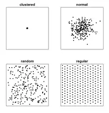 A fundamental problem of PPA is inferring whether a given arrangement is merely random or the result of some process. The picture illustrates patterns of 256 points using four point processes. The clustered process results in all points having the same location. Popular models are those based on simple circles and ellipses, inter-point (and especially nearest neighbor) distances, quadrats, and intensity functions. Each model yields estimates (that can increase insights into the underlying real-world processes) as well as associated goodness-of-fit diagnostics.