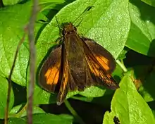 Polites mystic, the long dash or long dash skipper, is a species of butterfly. The species is commonly found in north of North America and in mountains in the south of North America, in grassy habitats.[1] The grassy areas include meadows, marshes, streamsides, wood edges, and prairie swales. On the top, the species has dark brown reddish to yellowish-orange markings. The forewing of the female has a broad black patch at the base. The forewing of the male has a long, slightly curved stigma which may be connected to the dash near the apex. Underneath the hindwing, the species is orange brown with a curved band of equal-sized yellow spots.[2]