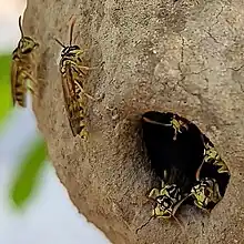 Nests are often pear shaped and made primarily out of mud. Polybia emaciata nest are well known for having only one circular opening in the nest through which all wasps enter and exit. This allows for a unique defensive behavior, which is discussed later on in the defense section.[6]