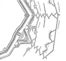Marc René, marquis de Montalembert (1714–1800) envisaged a system to prevent an opponent from establishing their parallel entrenchments by an overwhelming artillery barrage from a large number of guns, which were to be protected from return fire. The elements of his system were the replacement of bastions with tenailles, resulting in a defensive line with a zigzag plan, allowing for the maximum number of guns to be brought to bear and the provision of gun towers or redoubts (small forts), forward of the main line, each mounting a powerful artillery battery. All the guns were to be mounted in multi-storey masonry casemates, vaulted chambers built into the ramparts of the forts. Defence of the ditches was to be by caponiers, covered galleries projecting into the ditch with numerous loopholes for small arms, compensating for the loss of the bastions with their flanking fire.[6] Montalembert argued that the three elements, would provide long-range offensive fire from the casemated main curtain, defence in depth from the detached forts or towers and close-in defence from the caponiers.[7] Montalembert described his theories in an eleven-volume work called La Fortification Perpendiculaire, which was published in Paris between 1776 and 1778.[6] He summarised the benefits of his system thus; "...all is exposed to the fire of the besieged, which is everywhere superior to that of the besieger, and the latter cannot advance a step without being hit from all sides".[8]
