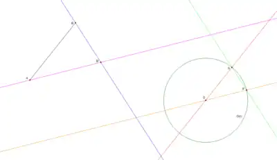 Still other variations exist. It suffices to have two non-intersecting, non-concentric circles (without their centres), provided that at least one point is given on either the centerline through them or on the radical axis between them, or provided any two parallel lines arbitrarily in the plane. It also suffices, alternatively, to have three non-intersecting circles.[5] Once a single center is constructed, the scenario again reduces to the original hypothesis of the Poncelet-Steiner theorem.